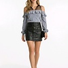 Avelisse is een elegante off-shoulder top met een subtiele ruche langs de halslijn en transparante tule banden over de schouders.