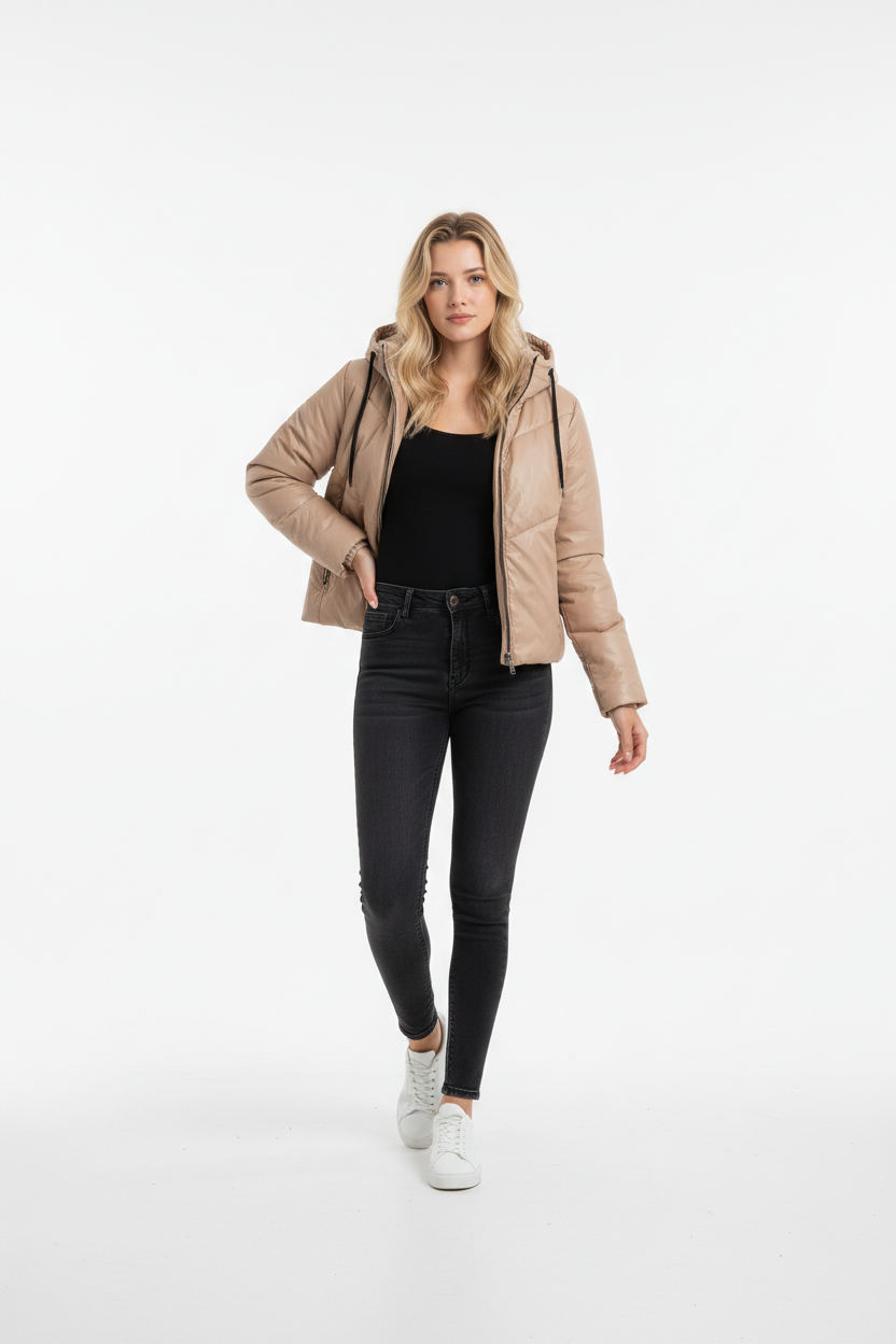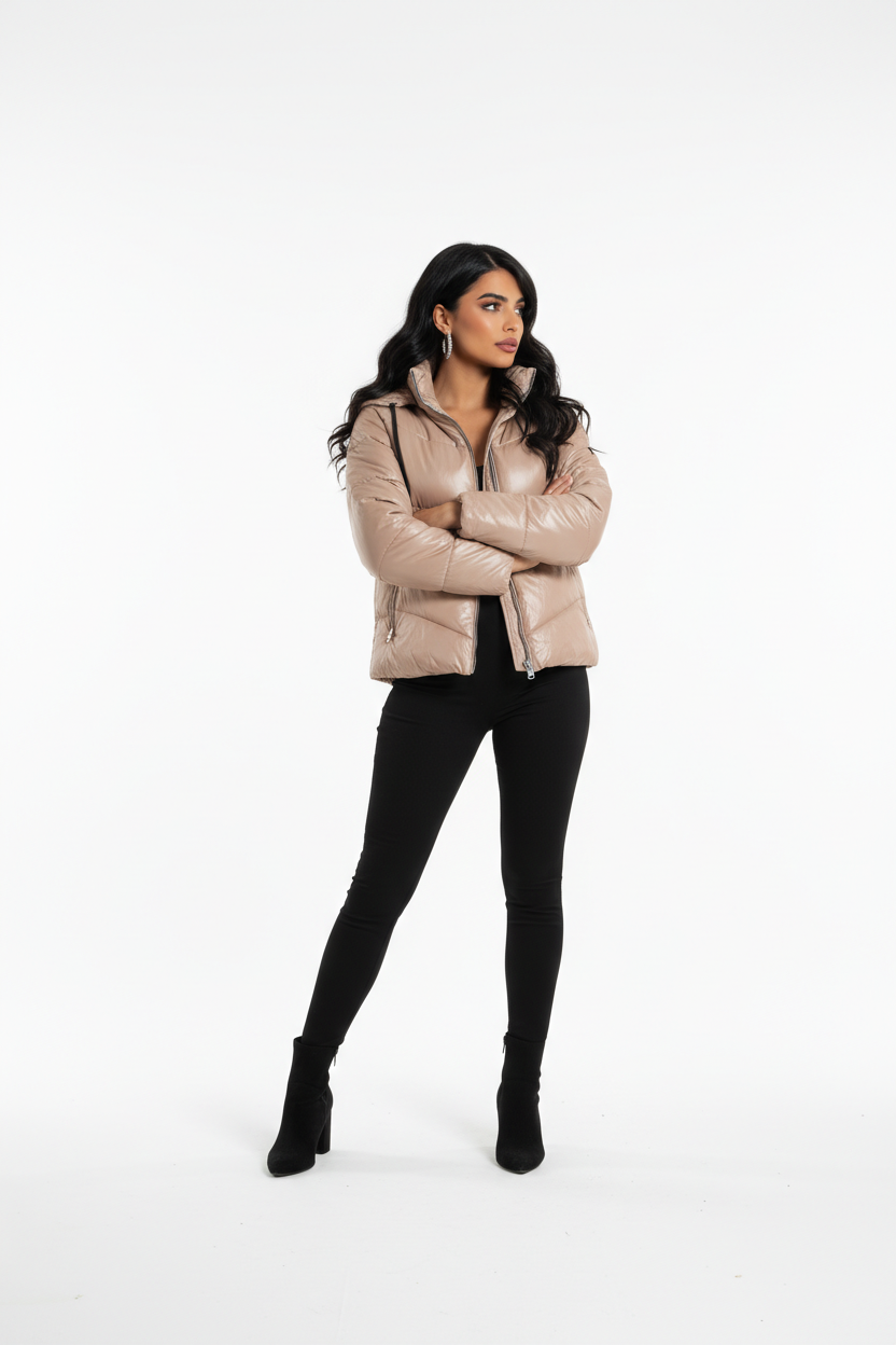 Calista is een dik gewatteerd faux leren jack in 2 warme kleuren. Met capuchon, praktische zakken en een comfortabele pasvorm biedt dit jack optimale warmte en een stijlvolle uitstraling voor de koudere maanden.