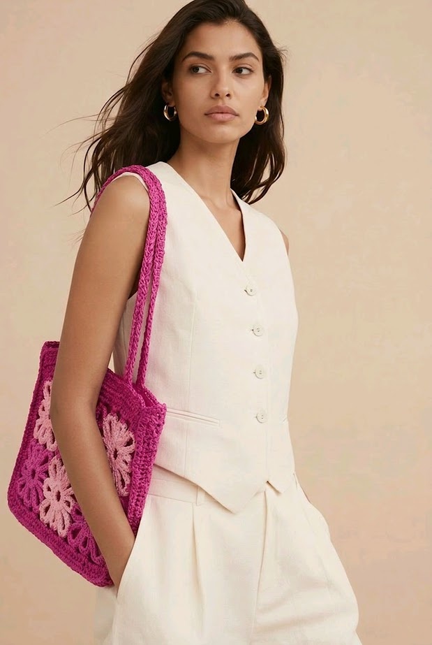 Dames schouder tas duurzaam gemaakt van papier, met geweven bloemen, verkrijgbaar in vier kleuren, leuk voor de strand dagen.