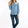 Denim blouse met delicate witte broderie op schouders en bovenrug. Gemaakt van 100% katoen voor comfort en ademend vermogen. Ideaal voor een casual-chique look die veelzijdig te combineren is.