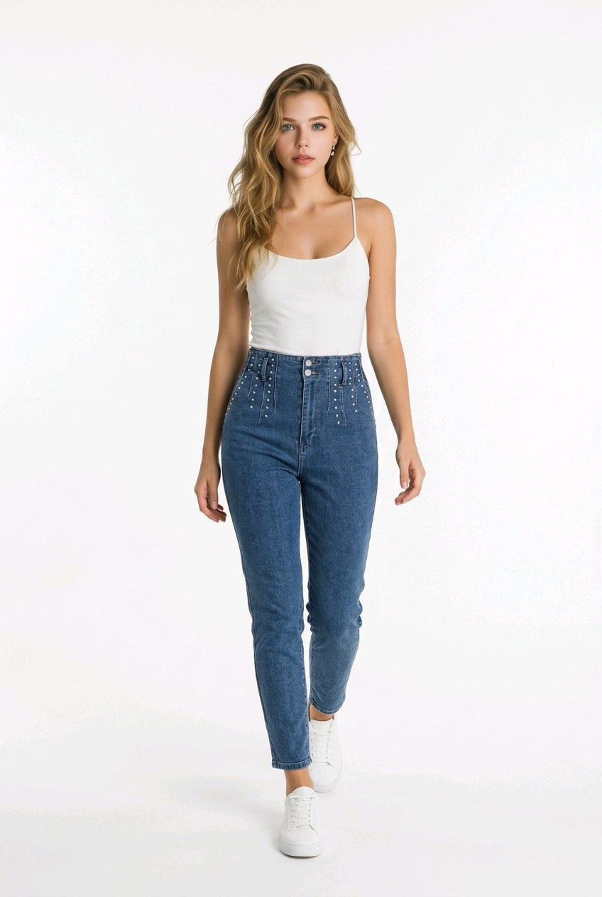 Dames denim broek voegt glamour toe met studs bij de taille. Dankzij de hoge taille, stretch en functionele zakken is het een comfortabele en trendy keuze die gemakkelijk te combineren is voor een stijlvolle look.