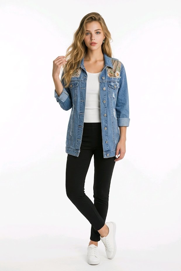 - Achterkant: De halve achterkant van het jack bevat hetzelfde transparante materiaal met geborduurde bloemen.