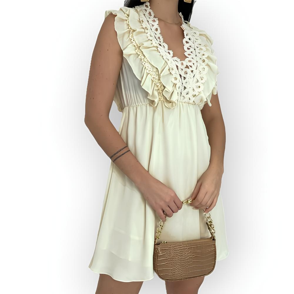 BeschrijvingDiva – Elegante Beige Skaterjurk met Borduurwerk, Rouches en Elastische Taille