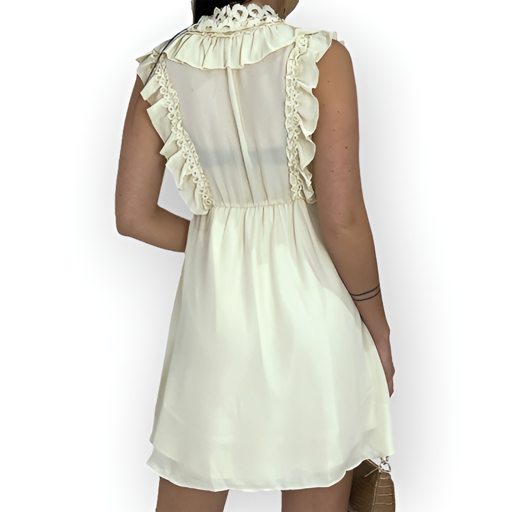 Liva is een elegante beige skaterjurk met fijn borduurwerk en speelse rouches. De elastische tailleband zorgt voor een flatterende pasvorm, terwijl de soepel vallende stof zorgt voor comfort en een romantische, vrouwelijke uitstraling.