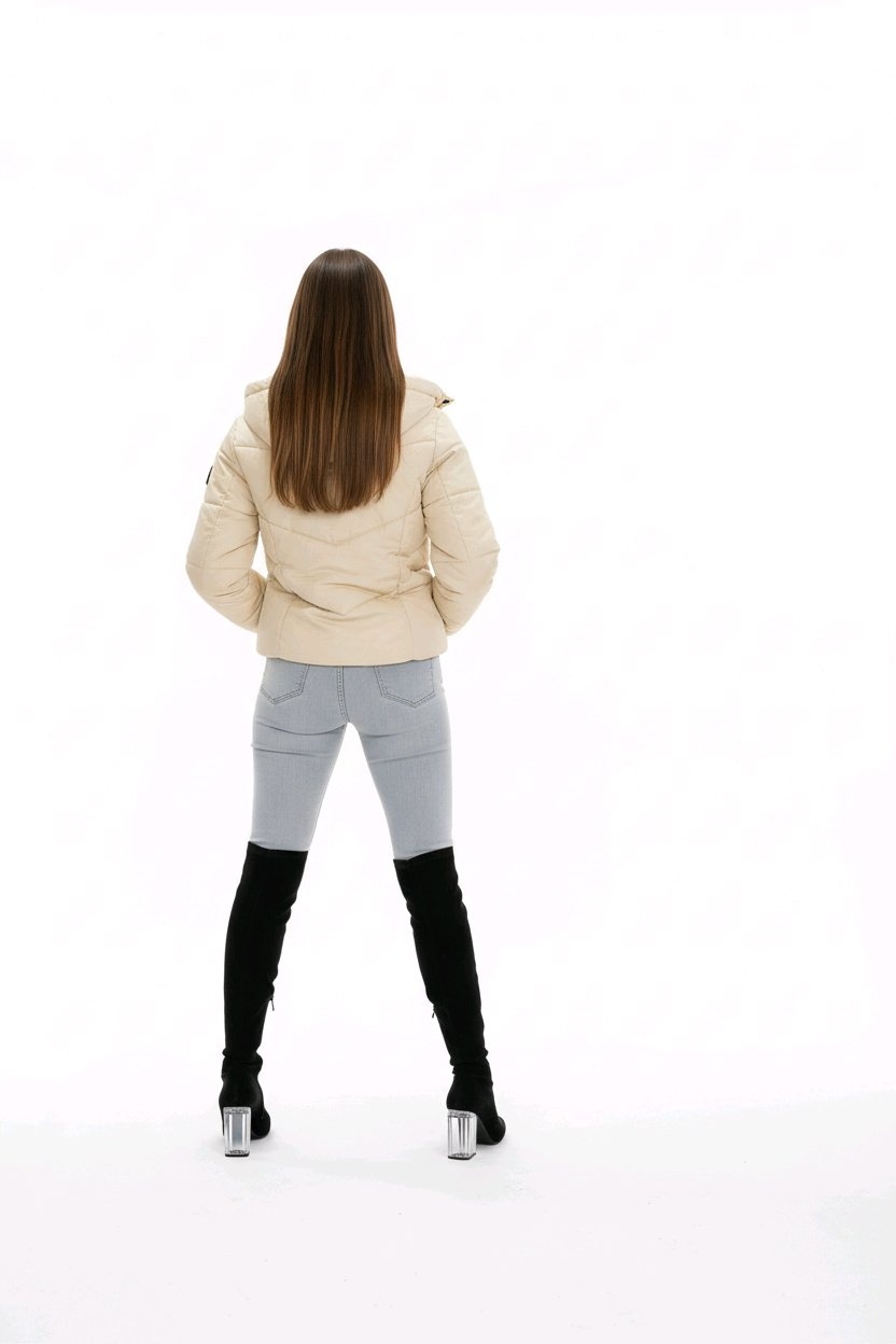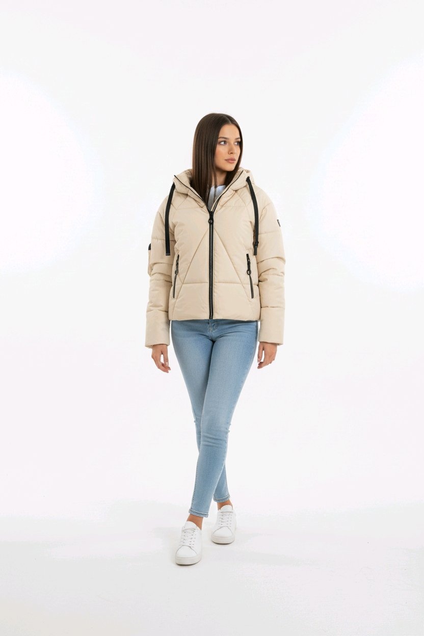 Dit luxe donsjack van kunstleer combineert een stijlvolle lederlook met optimale warmte. De beige kleur, gewatteerde afwerking en praktische details zoals ritszakken en capuchon maken het een comfortabele en modieuze keuze voor koude dagen.