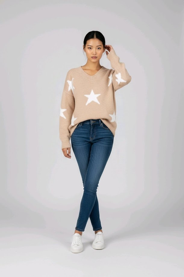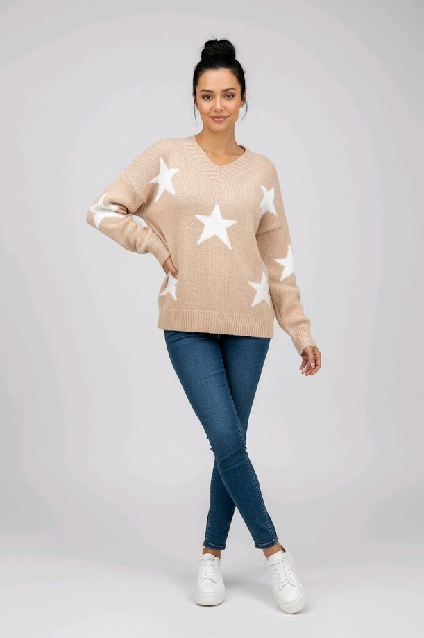 Elin is een dunne licht beige trui met witte sterren die zorgen voor een speels en stijlvol accent. De zachte beige-roze ondertoon geeft het model een warme en vrouwelijke uitstraling.