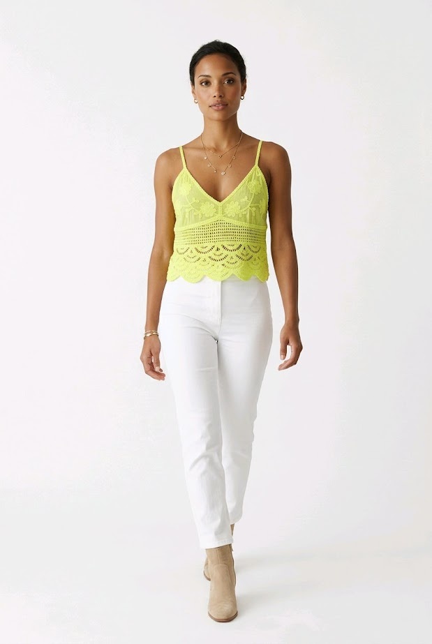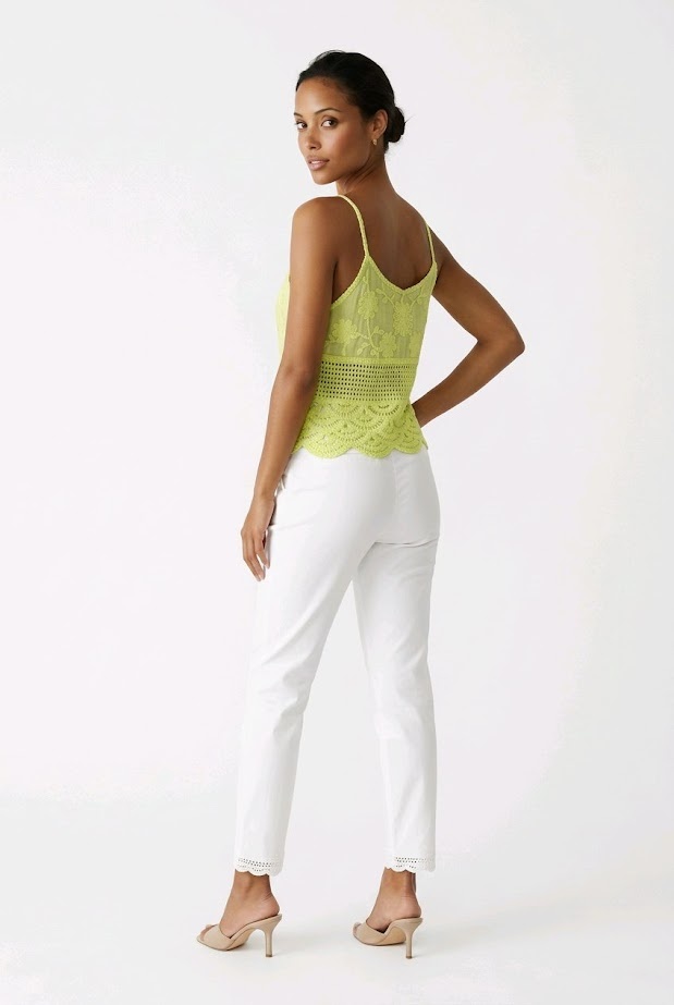 Fioréla is een romantische top met verfijnde kant- en broderiedetails en dunne bandjes. De luchtige katoenen stof zorgt voor een comfortabele en ademende pasvorm. De frisse kleuren geven een speelse en elegante uitstraling.