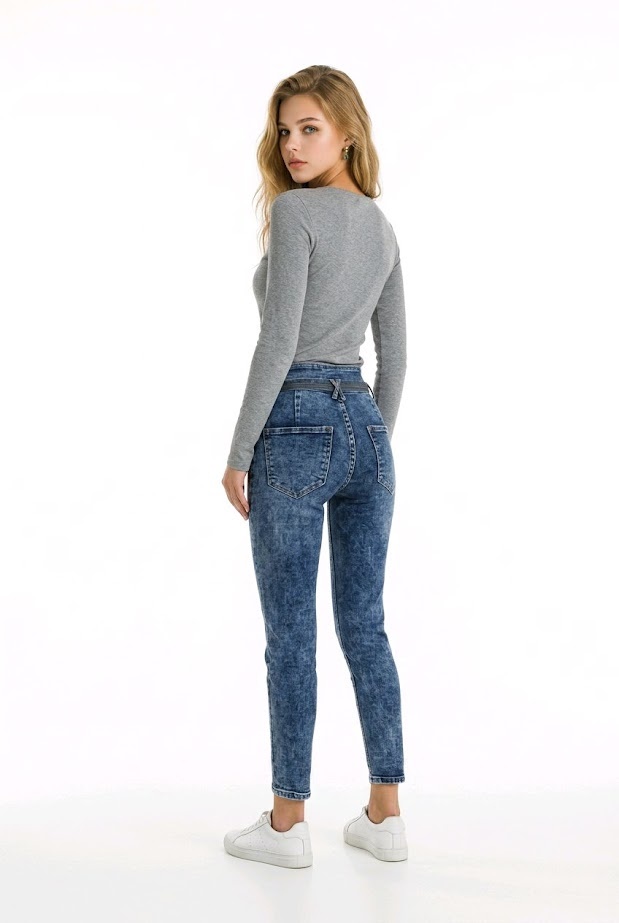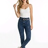 Gioia is een stijlvolle jeans met een vleugje glamour. De hoge elastische taille zorgt voor comfort, terwijl de riem met strass gesp een opvallend detail toevoegt.