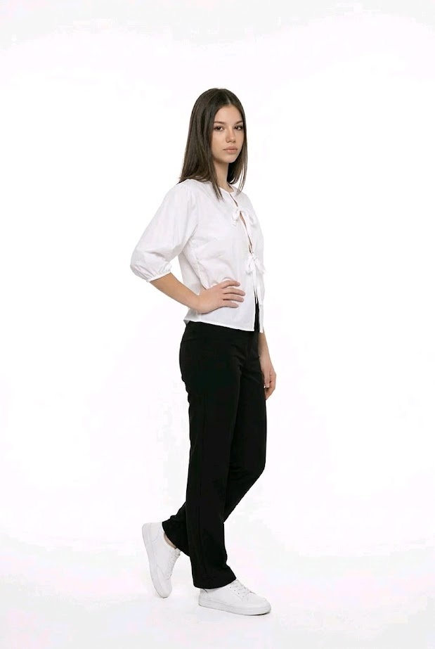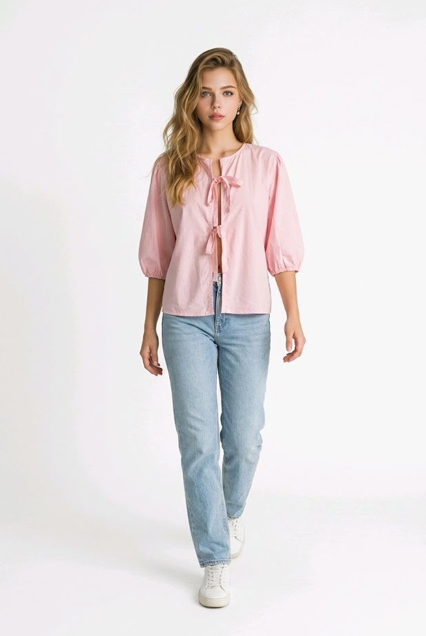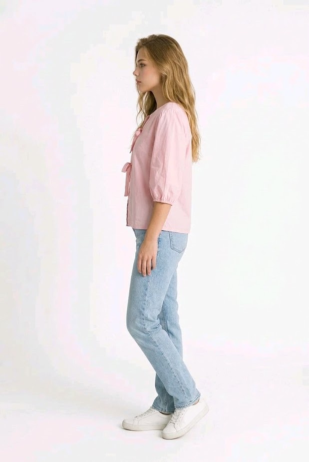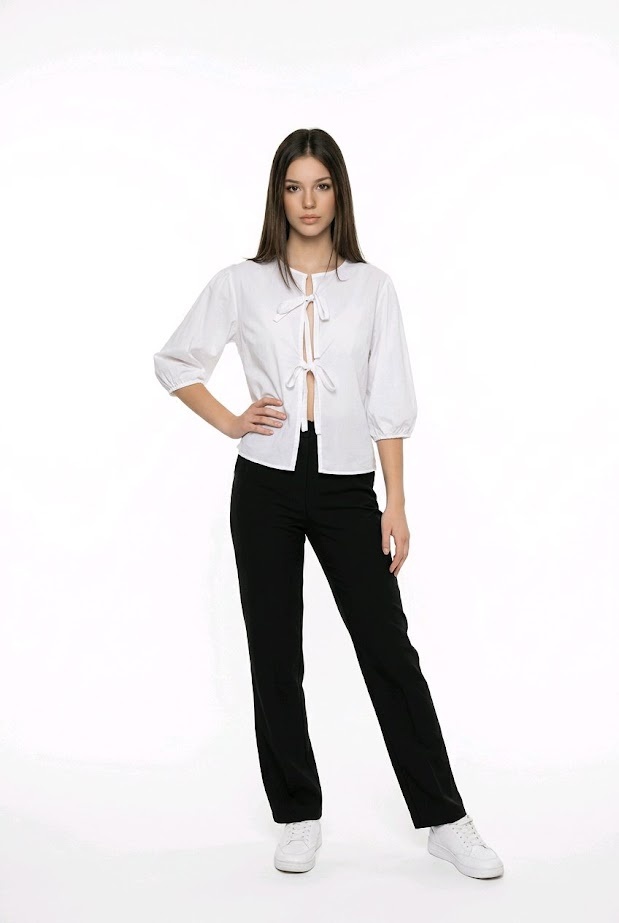 De Linae blouse straalt pure elegantie uit. Met halflange mouwen, zachte katoen en charmante striken aan de voorkant .