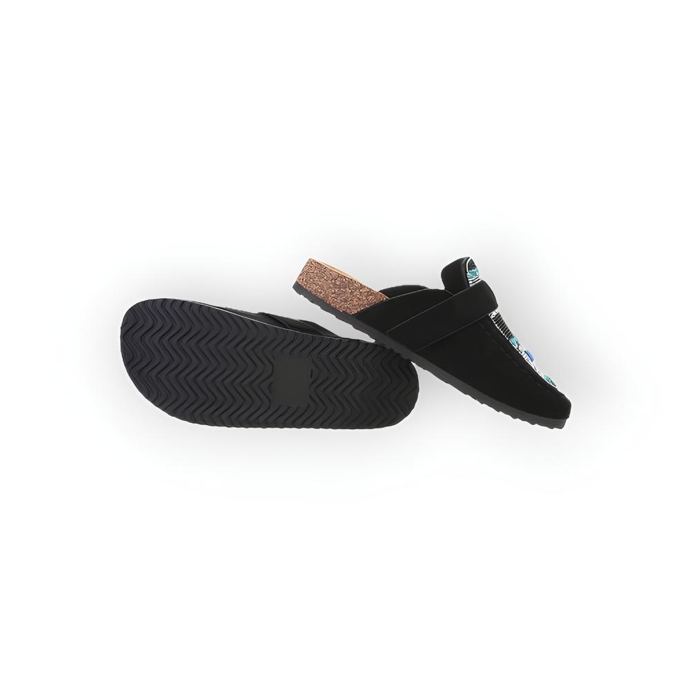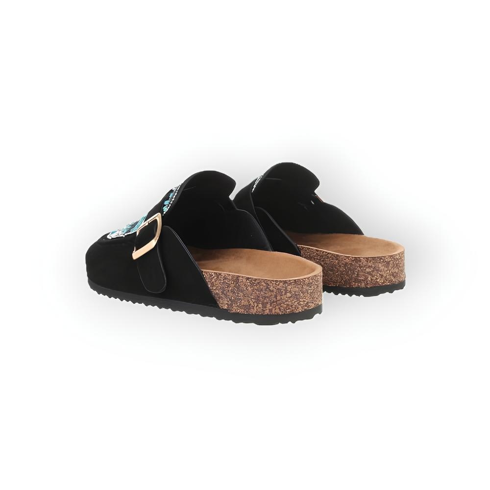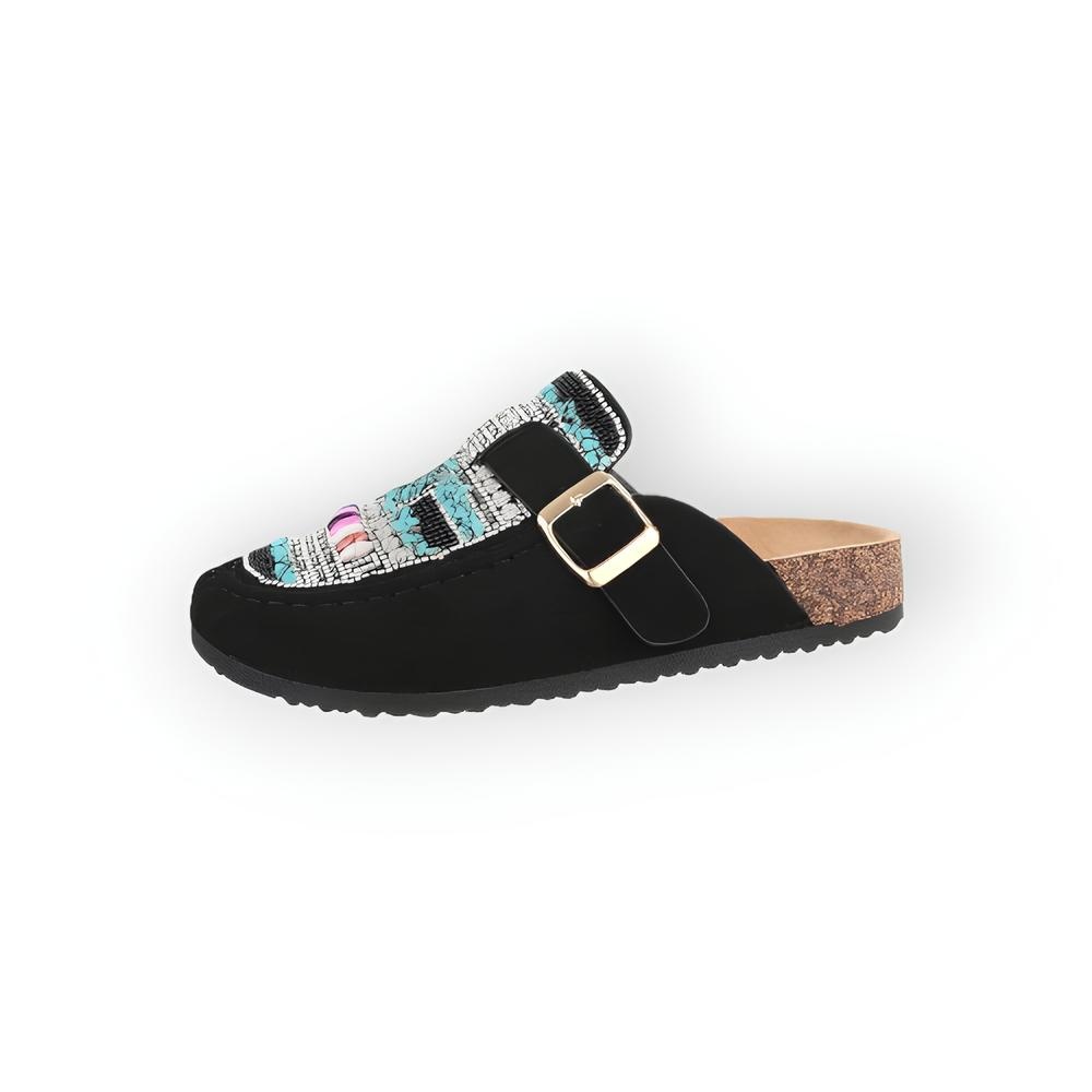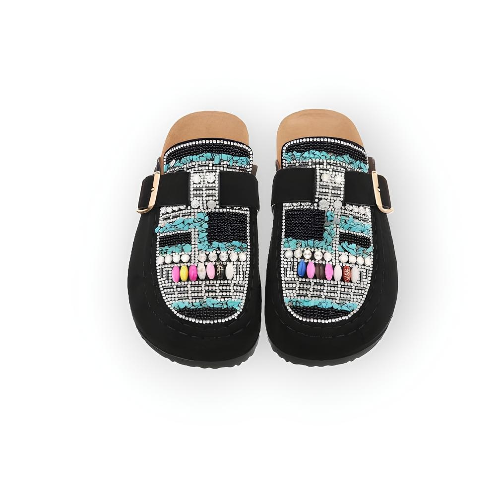 Elegante instappers van zacht suedine met glittersteentjes, kralen en een decoratieve gesp. Comfortabel als pantoffels en toch stijlvol – perfect voor dagelijks gebruik of een geklede look.