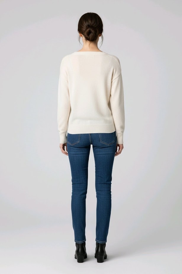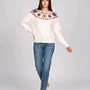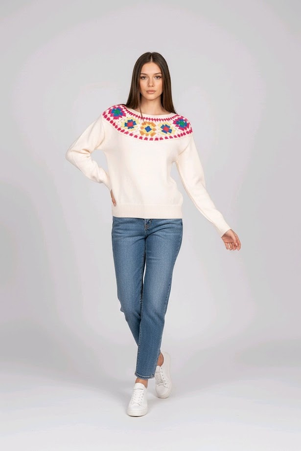 Lioren is een ecru trui met een bovenstuk dat is afgewerkt met handgehaakte bloemenmotieven in meerdere kleuren.