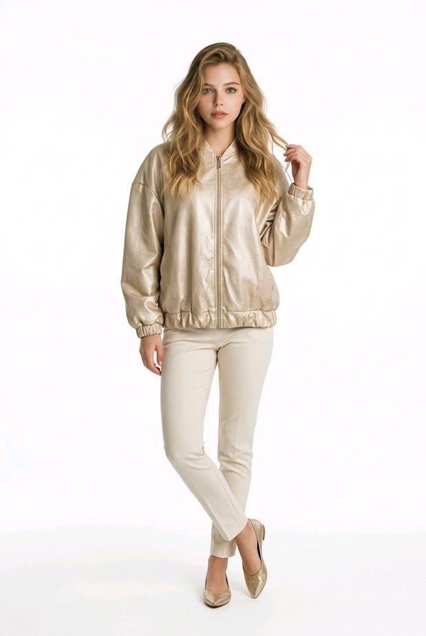 Voeg toe aan je outfit met de Luna Luxe – een goud/beige jack in imitatieleer dat elegantie en comfort perfect combineert. De vleermuismouwen en subtiele glans maken het een ware statement piece.