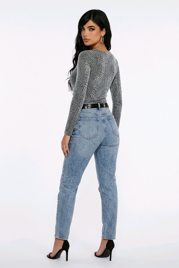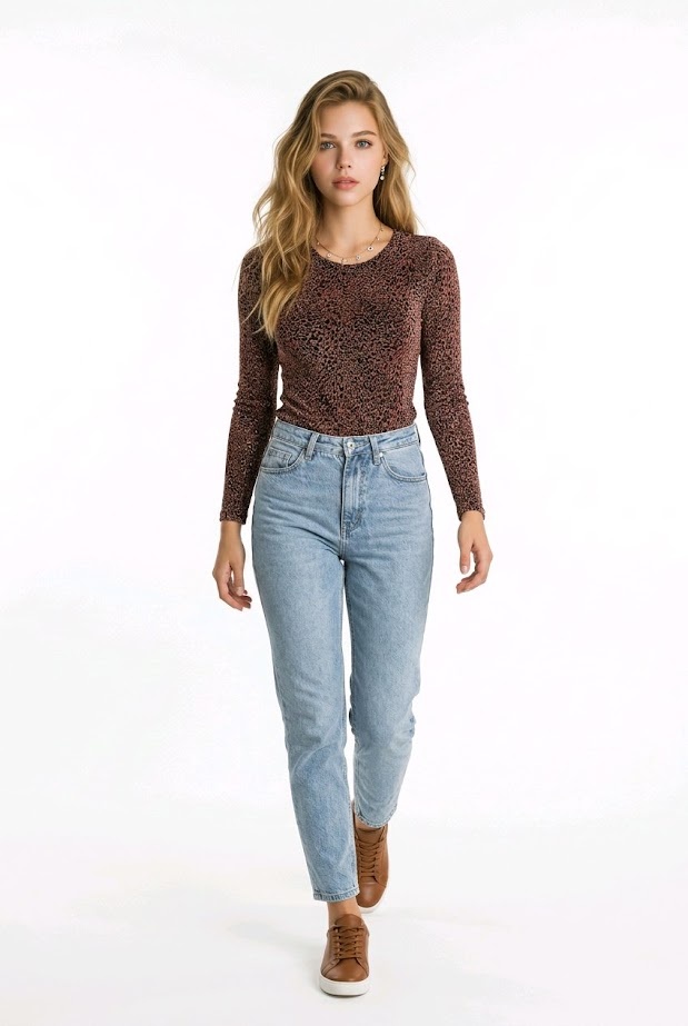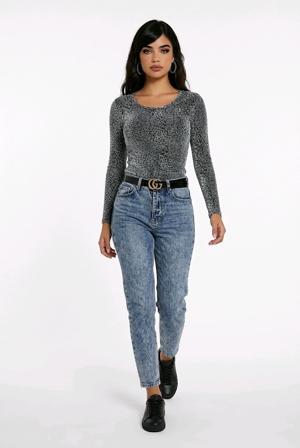 Top met lange mouwen en glinsterende luipaardprint, verkrijgbaar in zilver of cognac. Comfortabele stretchstof, ideaal voor chique of casual looks.