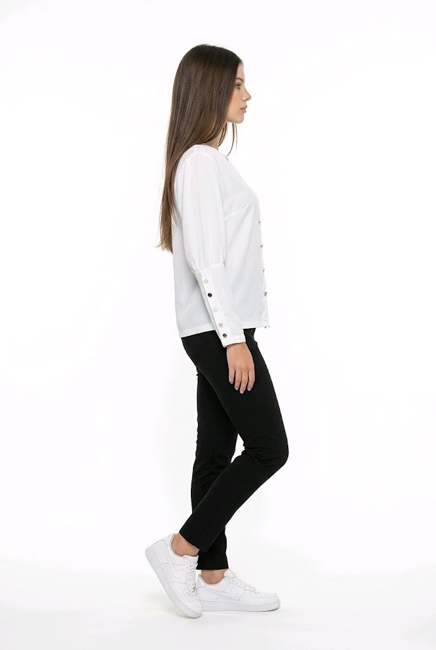 Witte blouse met goudkleurige sierknopen en smal toelopende mouwen. De stof valt soepel en voelt zacht aan. Een blouse die eenvoudig