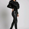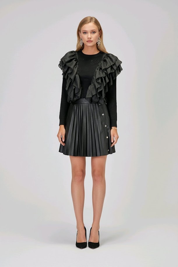 Marilou is een zwarte trui met drie lagen ruches volant die zorgen voor een romantische en vrouwelijke uitstraling. De lange mouwen zijn verfijnd afgewerkt en lopen in een punt vanaf de hals, wat het model een elegant en opvallend karakter geeft.