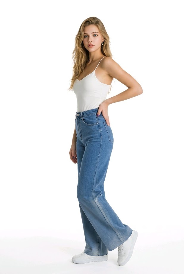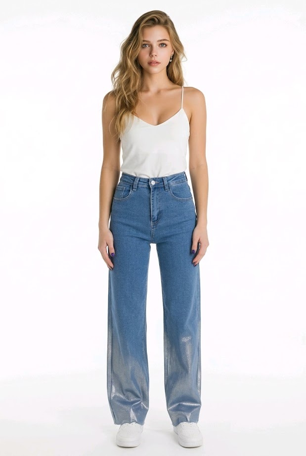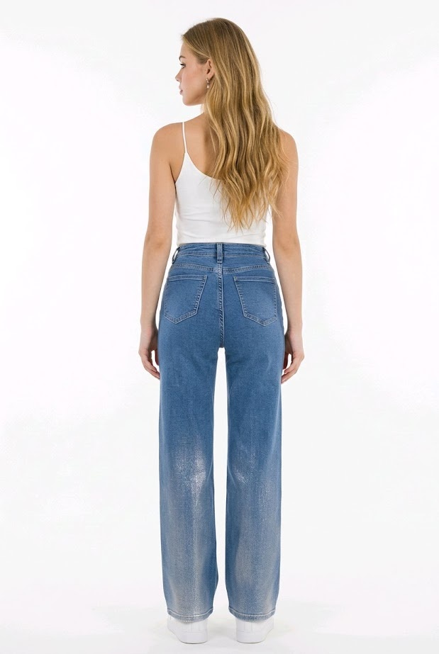 Wijde jeans combineert een moderne uitstraling met een zilveren metallic coating die lichter wordt vanaf de knie. Met hoge taille, stretch en functionele zakken is het een stijlvolle en comfortabele keuze voor elke outfit.