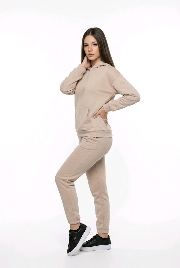 Mila is een comfortabel 3-delig joggingpak in beige, bestaande uit een joggingbroek, sweater met capuchon en een gewatteerde bodywarmer.