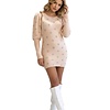 Naomi is een perzikkleurige tuniek jurk met halflange pofmouwen die halverwege de arm smal uitlopen voor een verfijnd silhouet. De subtiele gouden stippen geven het model een zachte glans.