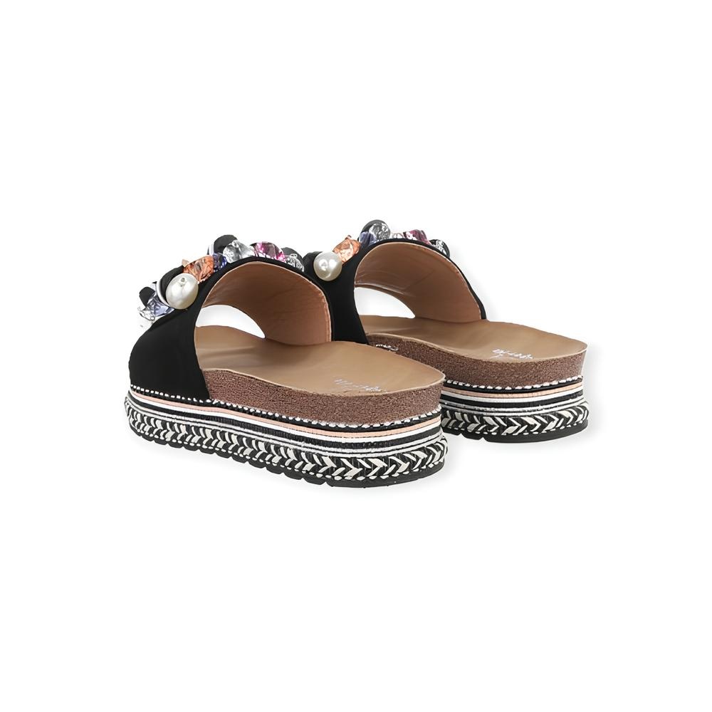 Noa is een echte eyecatcher voor zonnige dagen. De slippers zijn rijkelijk versierd met kleurrijke stenen, kralen en parels op een stevige zwarte band. De opvallende zool met gevlochten motief geeft een speelse, luxueuze twist aan je zomeroutfit.