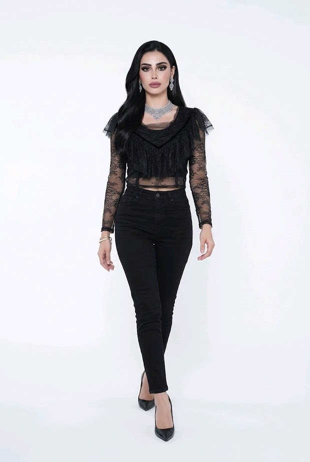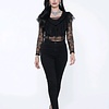 Noirielle is een elegante crop top met verfijnd kant en romantische ruches. De transparante kanten mouwen geven een vrouwelijke en chique uitstraling, terwijl het getailleerde model zorgt voor een mooie pasvorm.