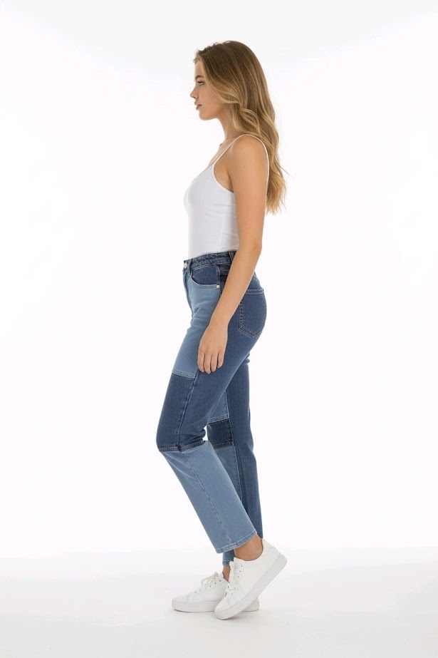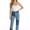 BeschrijvingPatty -Denim broek - Contrasterende Patchwork Vakken