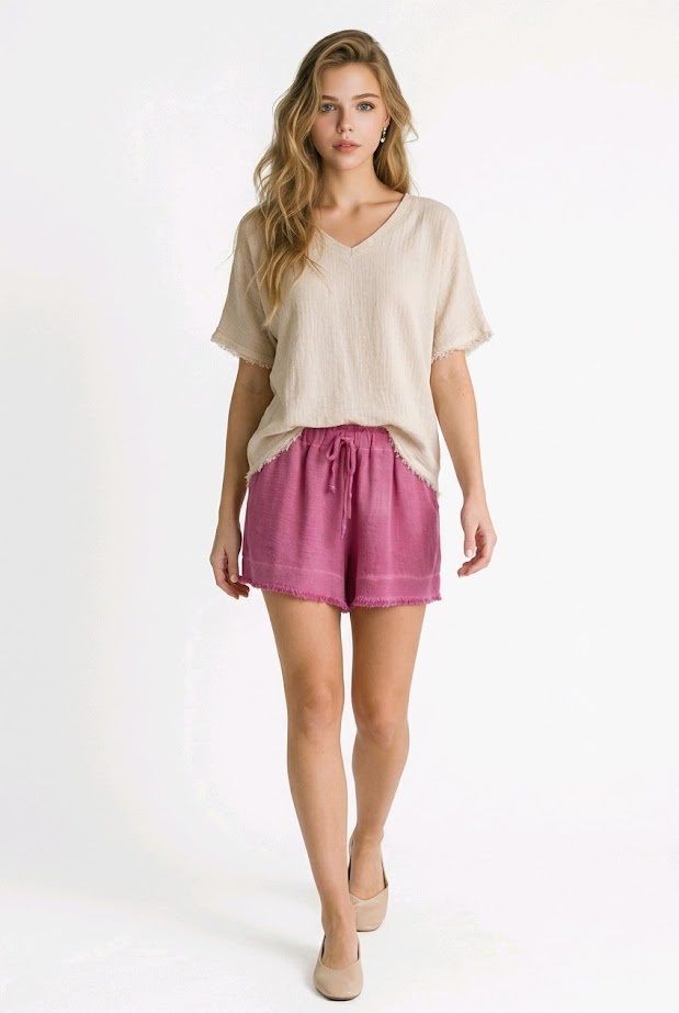 Shorts is gemaakt van grof katoen-linnen. De elastische tailleband met koord zorgt voor een perfecte pasvorm, Met gerafelde pijpuiteinden.