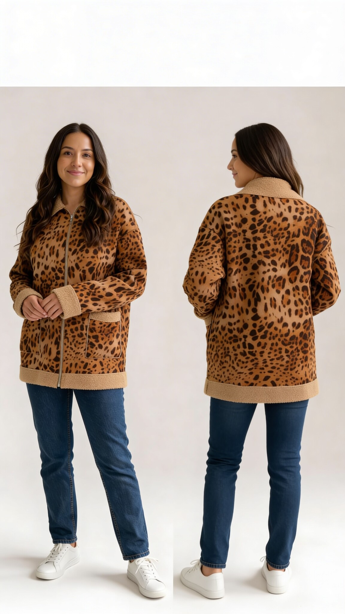 Reva combineert de wilde look van luipaardprint met zachte teddy accenten voor een jas die even knus als opvallend is. Dankzij de ruime pasvorm en warme voering blijf je stijlvol én comfortabel tijdens koude dagen.