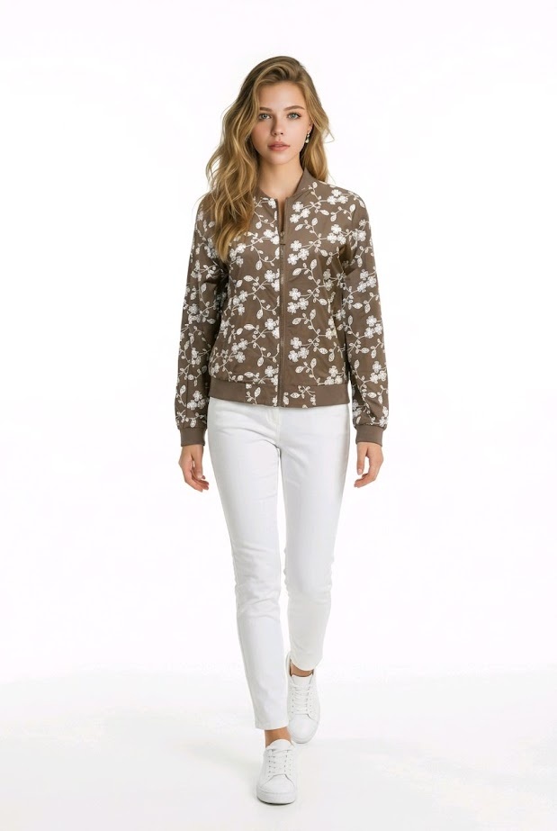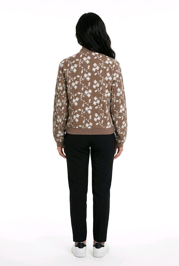 Dit taupekleurige zomerjack is de perfecte combinatie van stijl en comfort. De subtiele witte bloemenborduursels geven een verfijnde uitstraling. Perfect te combineren met de bijpassende skort in taupe.