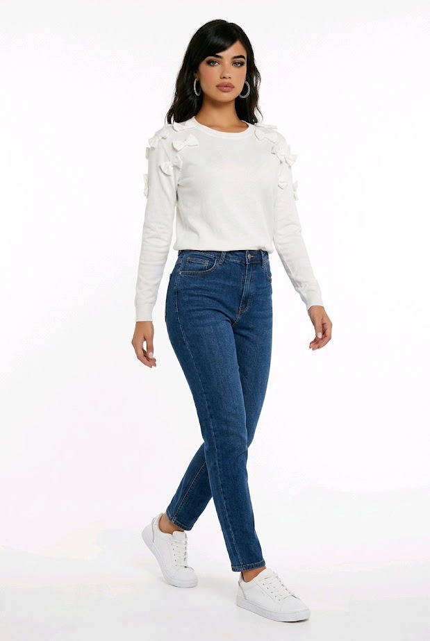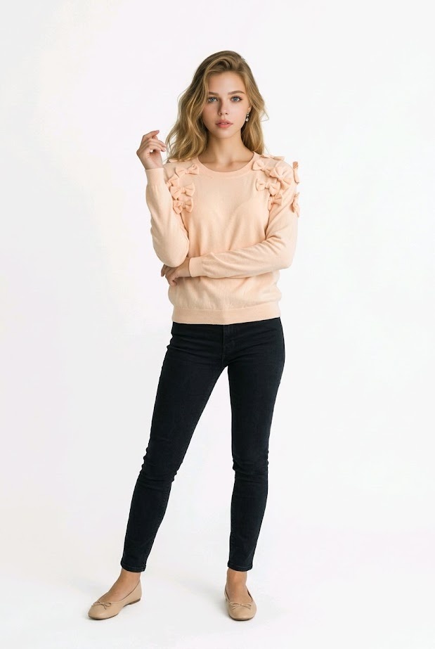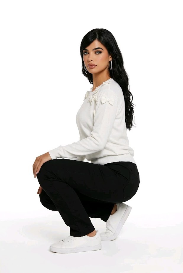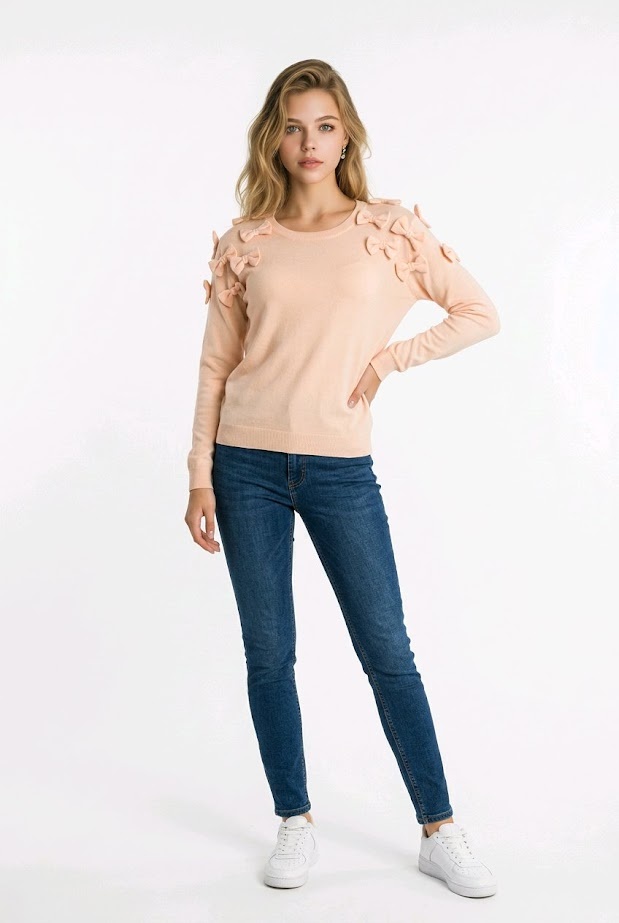 Top met lange mouwen en vlinderstrikken op de schouders. De zachte, rekbare stof zorgt voor een comfortabele pasvorm. Verkrijgbaar in wit en roze en eenvoudig te combineren met zowel casual als nette outfits.