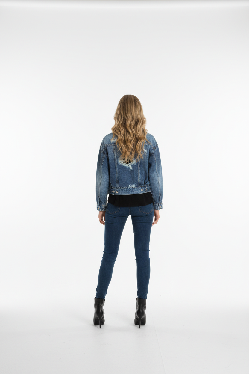 Roxelle is een raw used denim jack met een stoere, gedragen look en opvallende studs. De iets oversized fit en subtiele vleermuismouwen geven het jack een moderne uitstraling die perfect past bij zowel casual als edgy outfits.