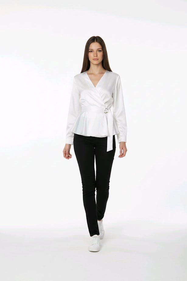 BeschrijvingSatéline – Witte Satijnen Top met Overslag en Riem