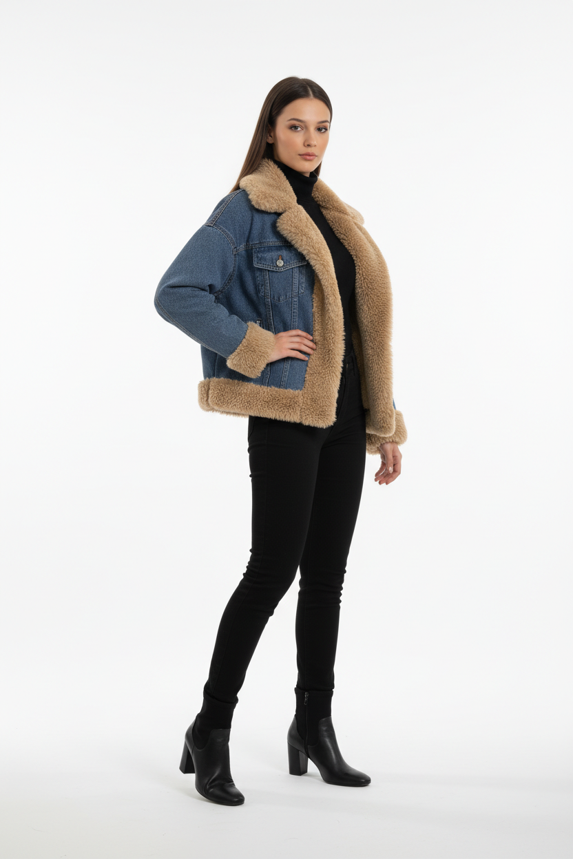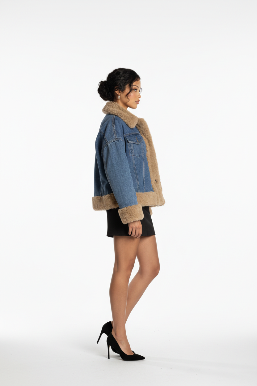 BeschrijvingSeléna – Jeansjack Met Camel Imitatiebontvoering