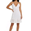 Luchtige witte jurk van 100% katoen met verfijnd opengewerkt borduurwerk. Voorzien van spaghettibandjes en halterhals voor een elegante look. Perfect voor zomerse dagen of stijlvolle gelegenheden.