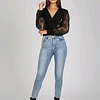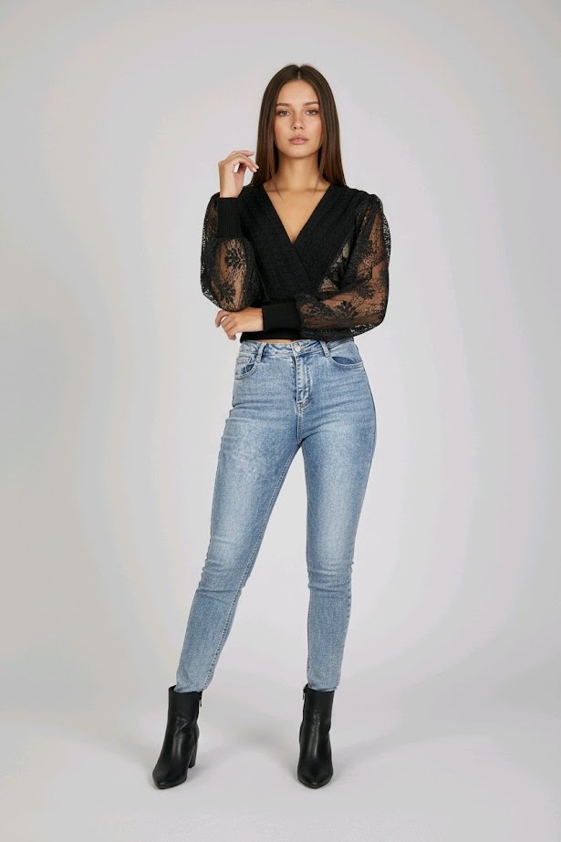 Seravelle is een zwarte wikkel crop top met een vrouwelijk silhouet en een verfijnde uitstraling. Het wikkelontwerp vormt de taille subtiel, terwijl de kanten mouwen een luxe en elegante textuur toevoegen.