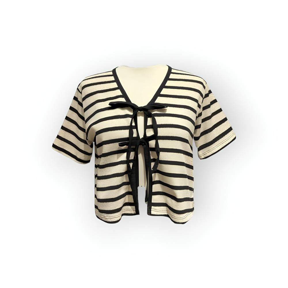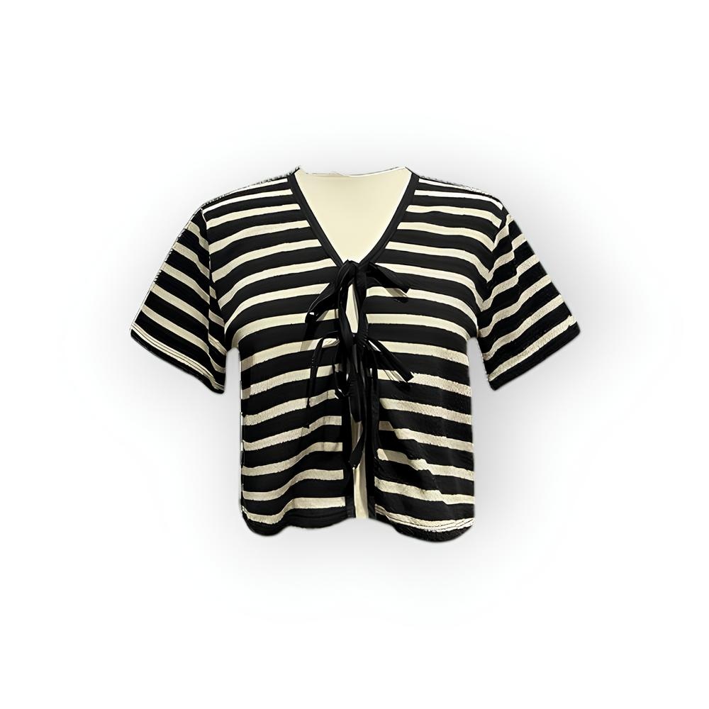 Maak een statement met dit modieuze zwart-wit gestreepte Korte top, voorzien van drie knotted sluitingen.