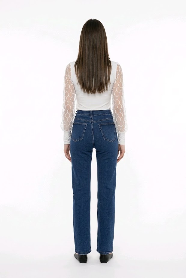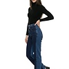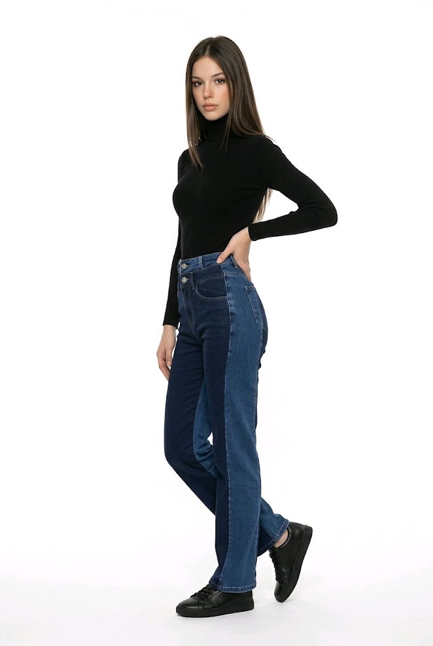 Deze twee-tonen denim broek combineert een moderne look met een slankmakend effect dankzij een lichte verticale baan op donkere denim. Hoge taille, stretch en functionele zakken maken het een stijlvolle en comfortabele keuze.