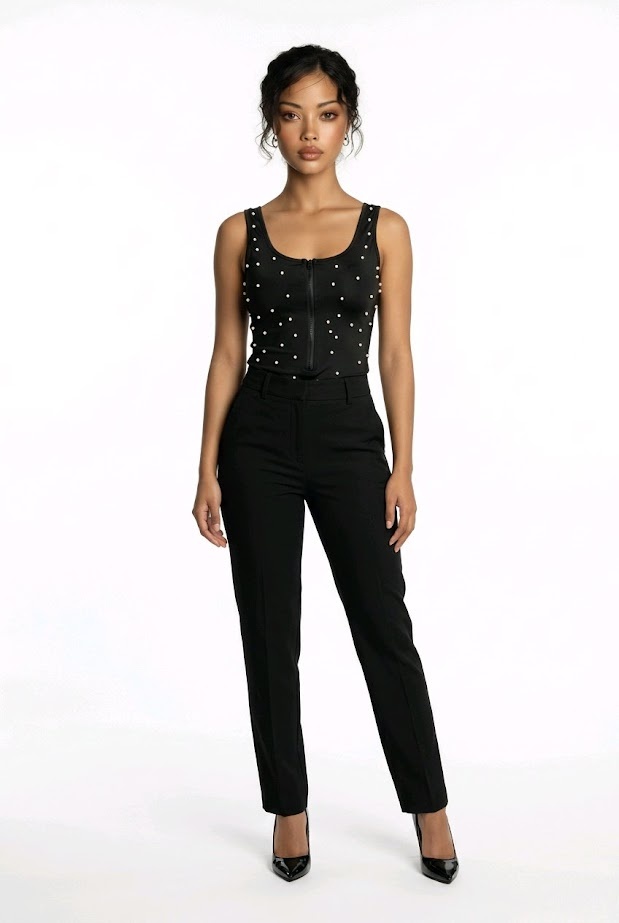 BeschrijvingVeloura – Zwarte Bodysuit met Parelstuds en Ritssluiting