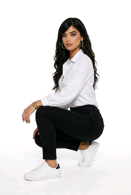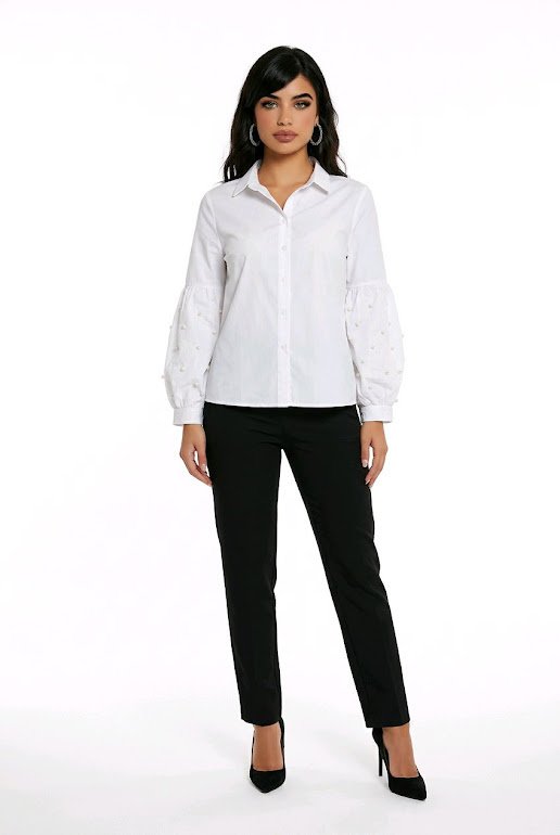 Elegant witte blouse met wijd uitlopende pofmouwen en pareldetails. Zachte, ademende katoenpasvorm, perfect voor werk, casual of chique looks. Flatteert diverse lichaamstypes dankzij licht getailleerd model.