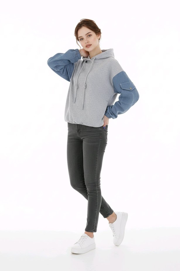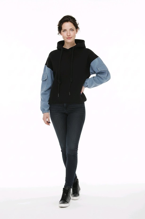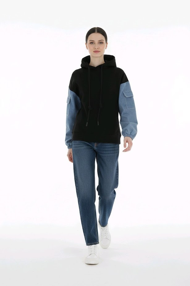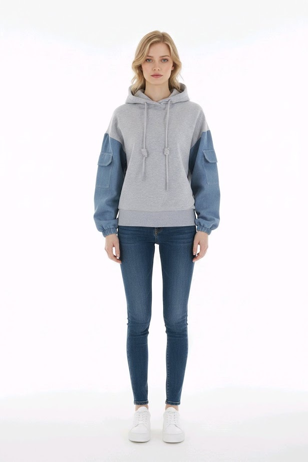 BeschrijvingZanvora – Sweater Met Denim Mouwen En Capuchon
