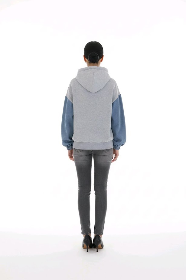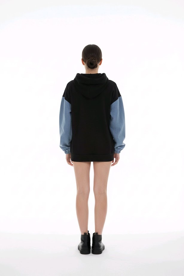 - Details: Denim mouwen, mouwzakjes, capuchon