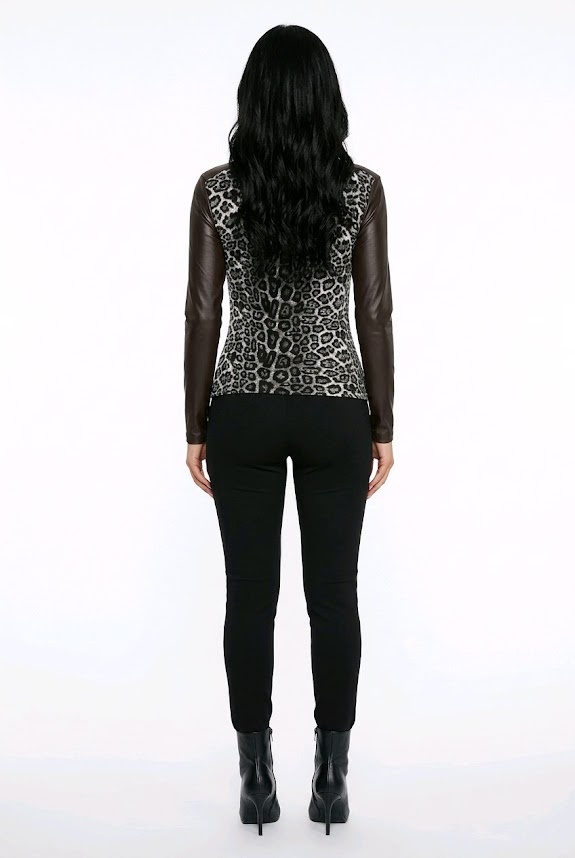 Top met zwart-grijs luipaardpatroon en stoere lederlook mouwen. De combinatie van print en gladde mouwen zorgt voor een opvallende look. Schoudervullingen geven extra vorm en maken de top geschikt voor zowel casual als avondoutfits.