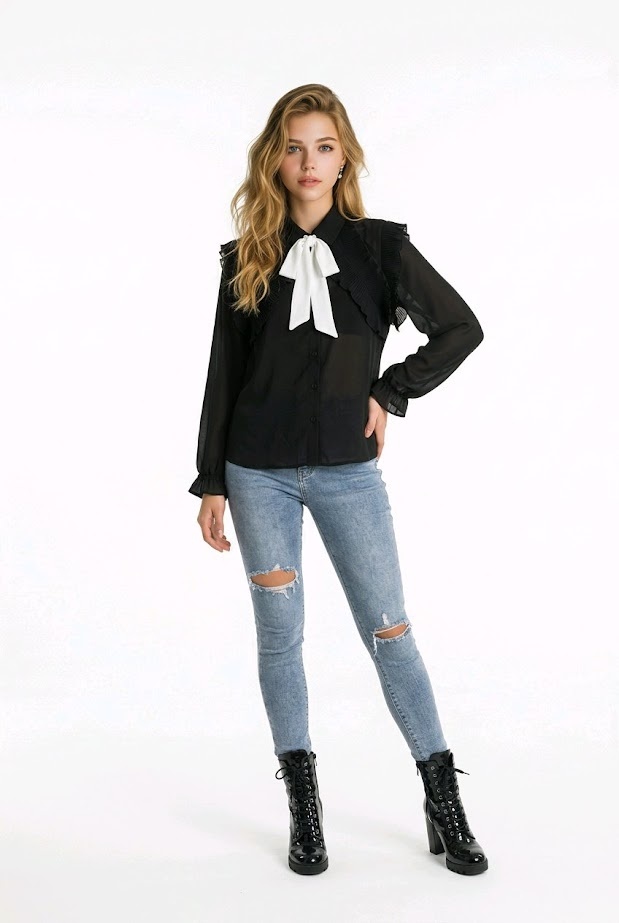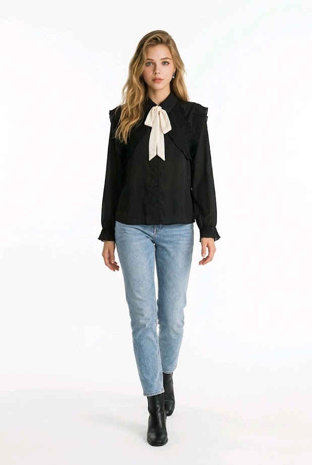 Elegant ontworpen zwarte blouse met diagonale geplooide band en wit striklint bij de kraag. Stijlvol en veelzijdig, perfect voor werk, casual of chique outfits.