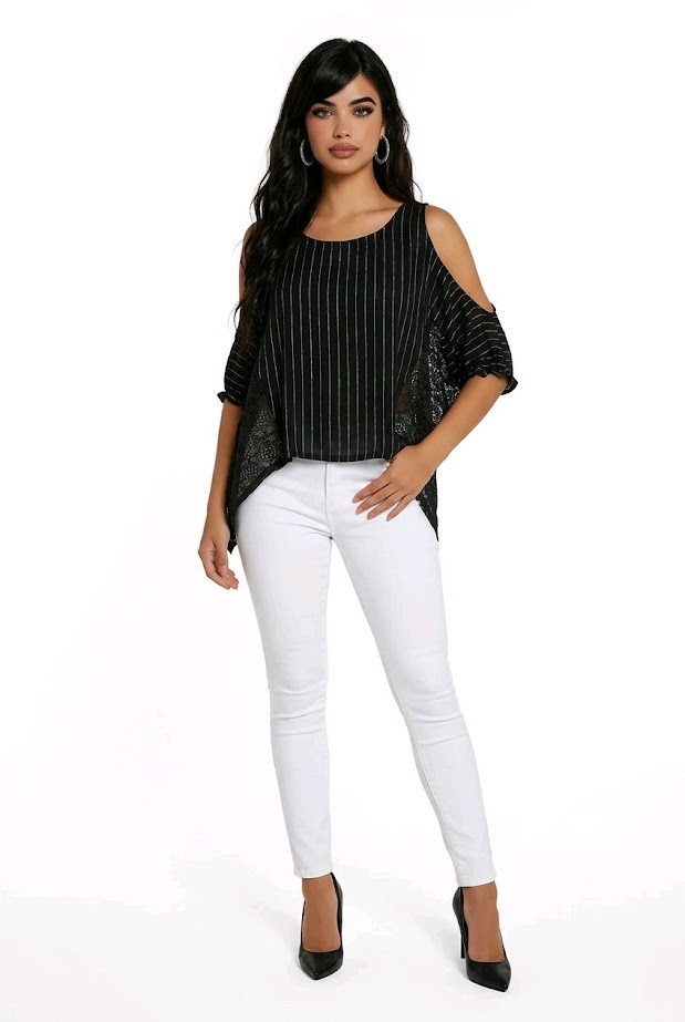 Zyrelle is een elegante off-shoulder top met wijde mouwen, verfijnde broderie en subtiele zilverdraad strepen. Het oversized model zorgt voor een comfortabele en stijlvolle pasvorm.